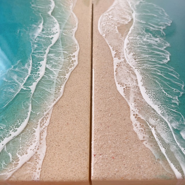 海トレイ サイズ 22㎝ × 12㎝ 木製トレイに波と透き通る海の水たまりを。 透き通って見えるのは沖縄の砂と貝、珊瑚の欠片… ※訳あり理由… 右下の小さな海の側面にレジンが垂れてしまっています。(写真あり) ※エポキシ樹脂は熱に弱いため、熱い物を置くのは避けてください。 ※気をつけてはいますが表面に傷やホコリ、凹凸がある場合があります。 ※劣化を防ぐため直射日光を避けた場所で飾っていただくことをオススメします。 ※ご覧いただく環境によっては色彩が画像とは多少異なって見える場合がございます。