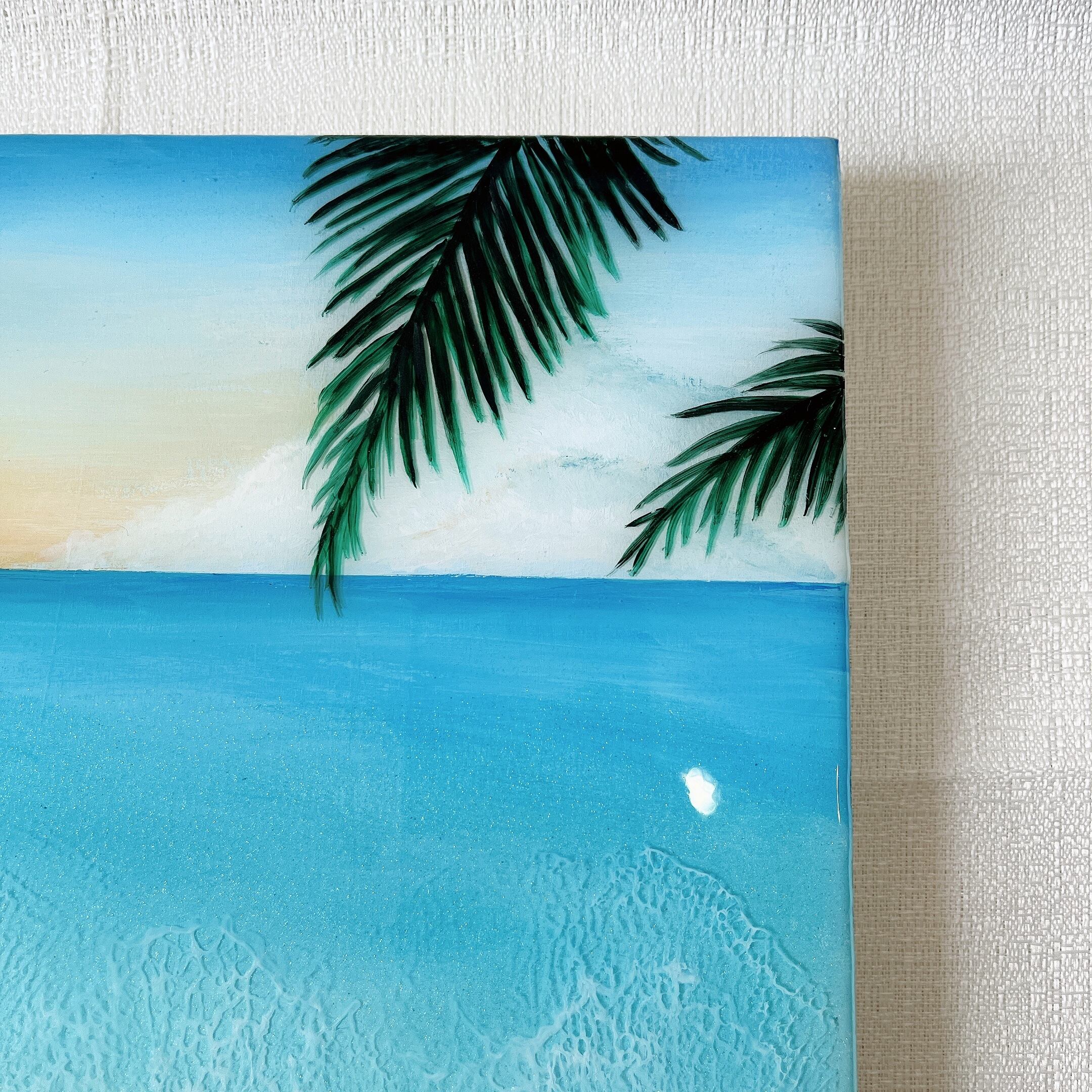 奥行きのある風景にヤシの葉を描き、夏らしい海のパネルに仕上げました。