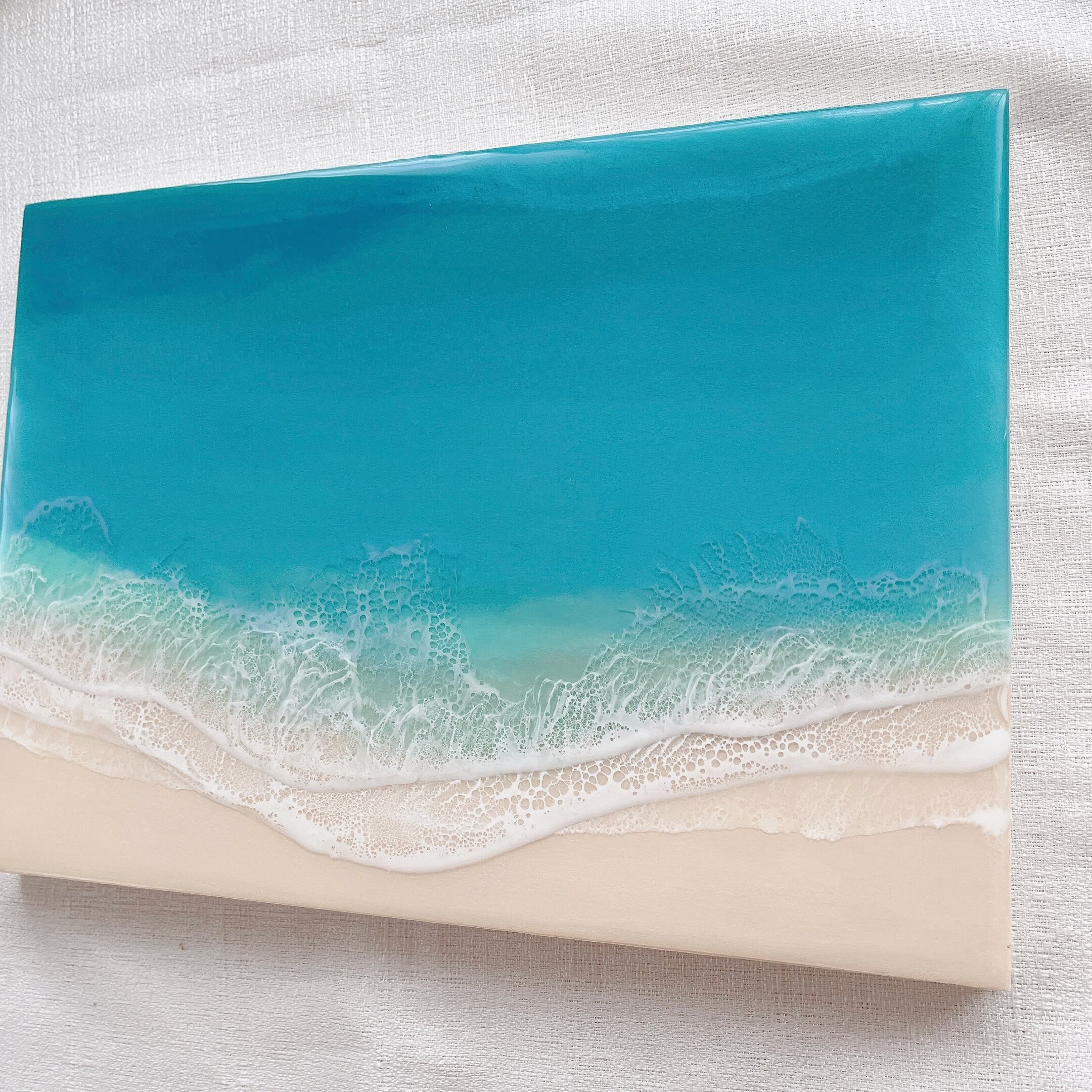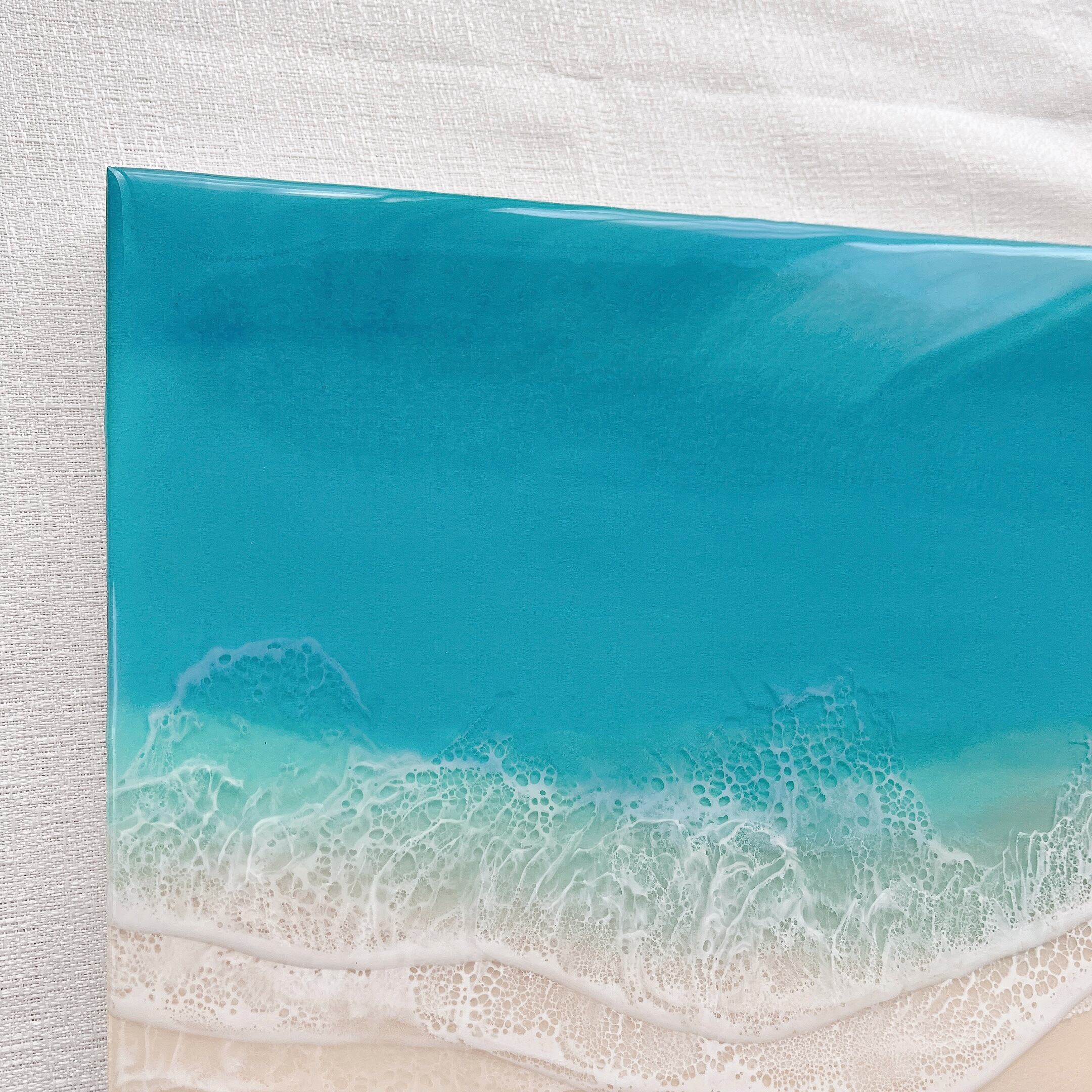 ウッドパネルに、エポキシ樹脂を着色し層を重ねて海を表現しています